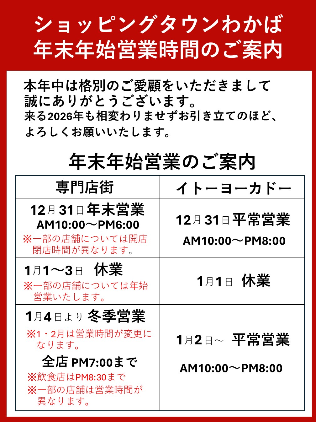 ショッピングタウンわかば年末年始営業時間のご案内